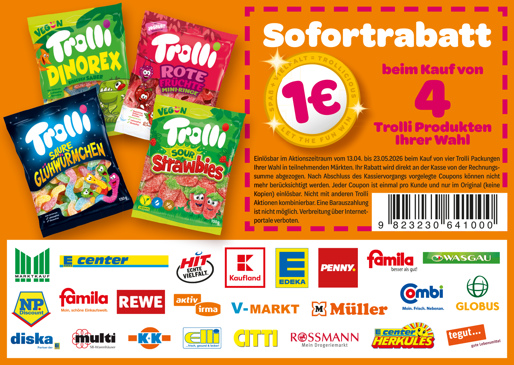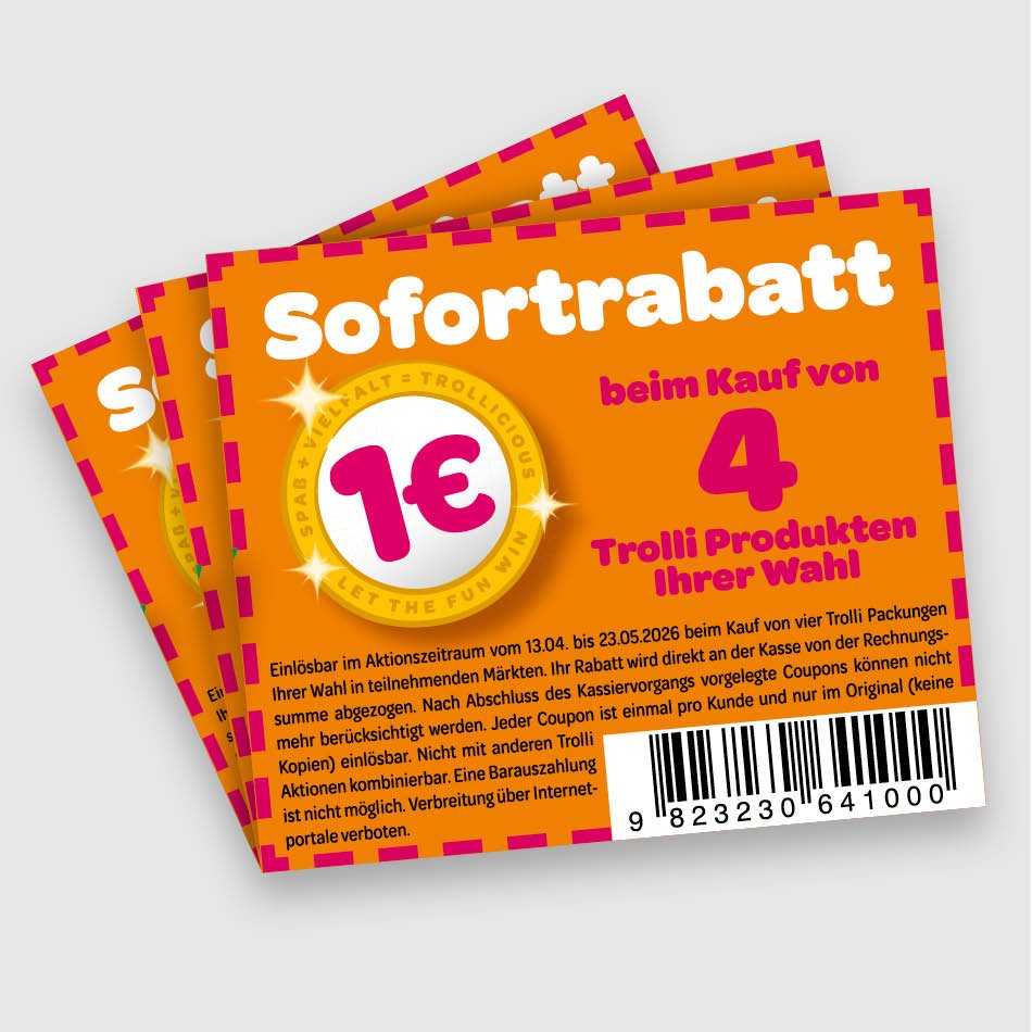 Einlösbar im Aktionszeitraum vom 13.04. bis 23.05.2026 beim Kauf von vier Trolli Packungen Ihrer Wahl in teilnehmenden Märkten. Ihr Rabatt wird direkt an der Kasse von der Rechnungssumme abgezogen. Nach Abschluss des Kassiervorgangs vorgelegte Coupons können nicht mehr berücksichtigt werden. Jeder Coupon ist einmal pro Kunde und nur im Original (keine Kopien) einlösbar. Nicht mit anderen Trolli Aktionen kombinierbar. Eine Barauszahlung ist nicht möglich. Verbreitung über Internetportale verboten. Probleme bei der Einlösung? Wir helfen auf couponplatz.de/service.